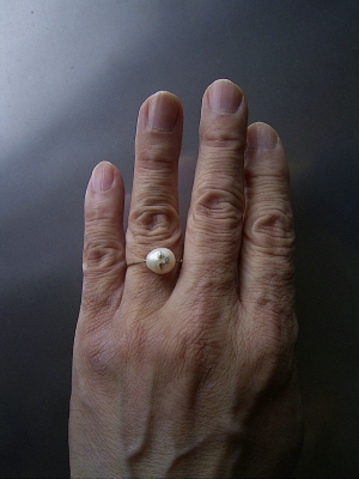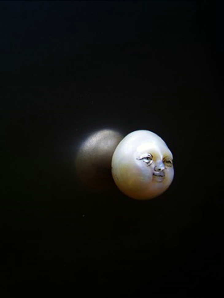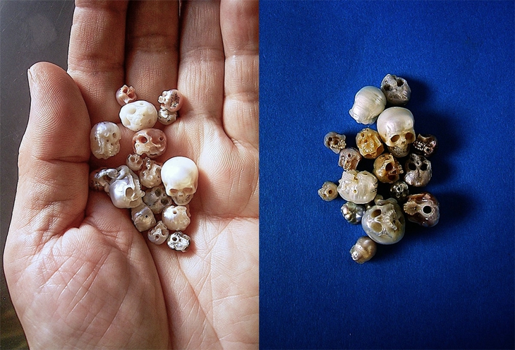 一个个袖珍作品形状各异,大小不一,但大多数都有一共同之处,以蚌中明珠为原材料,将其雕刻成人骨或是动物头骨的模样,再系缚于手环、项链或是胸针,不失美感,又别有新意。