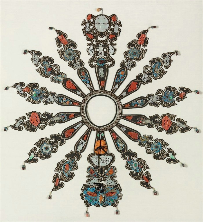 四合如意是山东民间常见的一种云肩图案。其结构特点是以米字为中心,外部绣以四季盆花或者折枝花,寓意家庭兴旺。