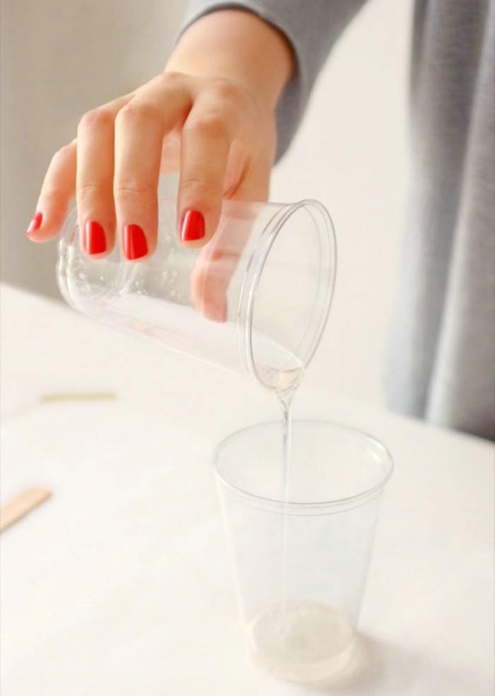 当计时器停止时,将溶液倒入准备好的另外一个杯子,用新的木条继续搅拌,将计时器设置一分钟,结束后将杯子和溶液静置五分钟。