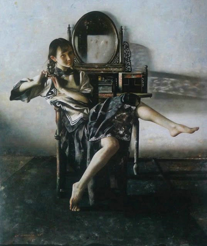 我们发现吕建军老师的油画里所有的女人都赤着脚,凡是了解过中国历史的人都知道,对于受封建思想压迫的女性来说,缠足的目的是她们被冠以“三寸金莲”的一种赞赏。塑造女子三寸金莲的工作通常是在女孩五岁左右,母亲就开始为女孩裹脚,因为这时女孩的骨头富有柔韧性和可塑性。再大一点怎么裹也没有作用。经过几年会变成一种尖脚形的脚,这种脚最终形成所谓的三寸金莲。
