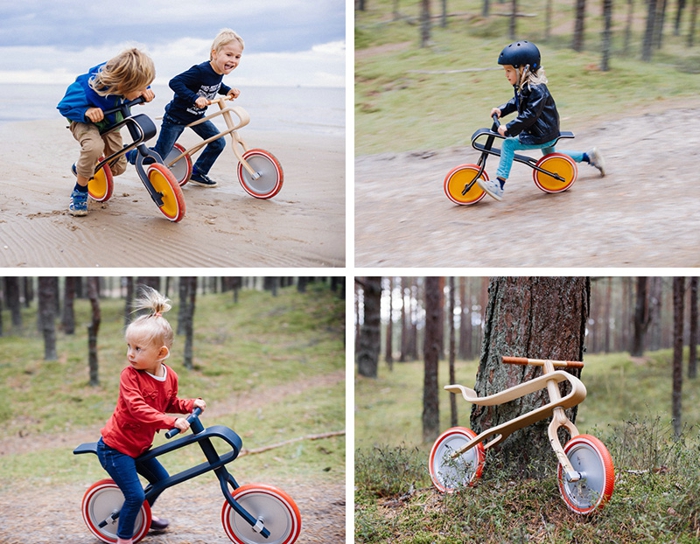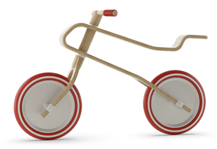 设计师Krisjanis Jermaks设计了一款儿童自行车Brum Brum。Brum Brum自行车的车架为一块细长的胶合板弯曲而成,车架的一段弯曲成一个车座悬在空中,车架的另一端中间挖空形成自行车的车轮竿与后车轮的主轴相衔接。