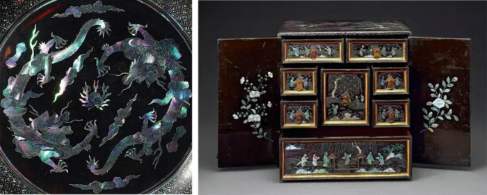 相传起源于商代的漆器。20世纪80年代初,中国考古工作者在玻璃河西周燕国墓地发掘到不少西周嵌螺钿漆器,其中有1件漆器,上面的彩绘兽面凤鸟纹就采用了螺钿工艺,这是迄今为止所见到的世界上最早的螺钿漆器之一。