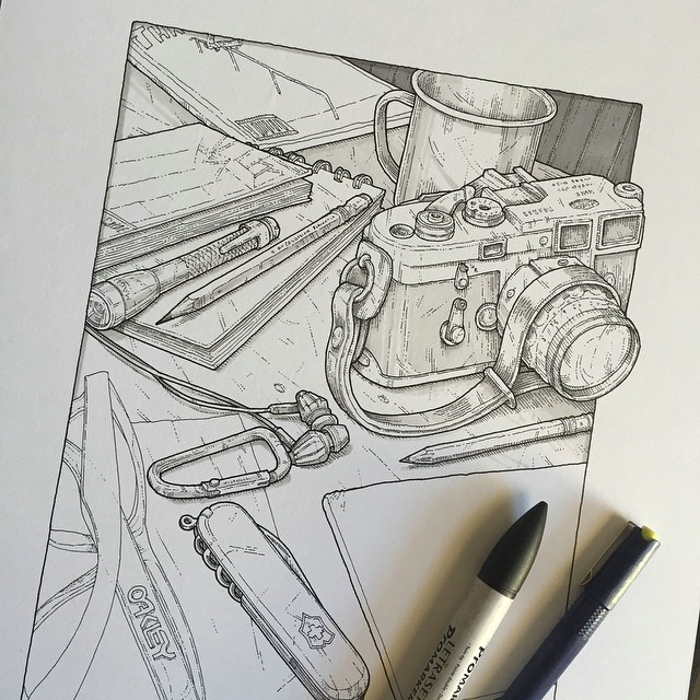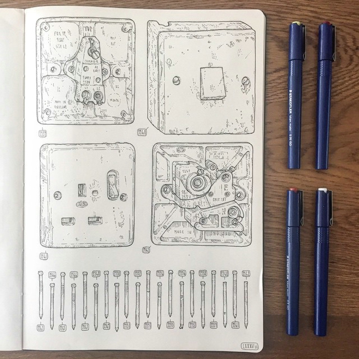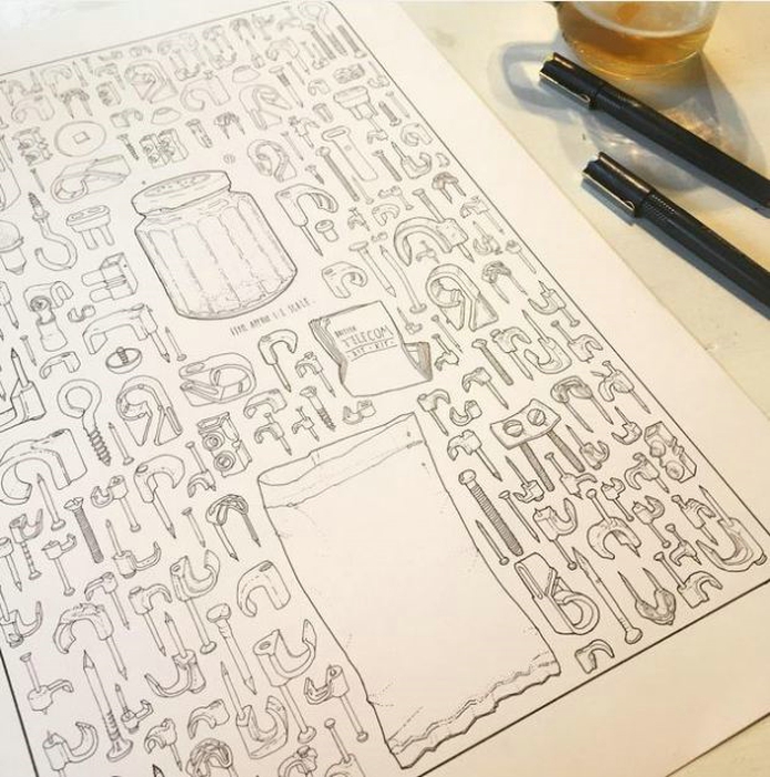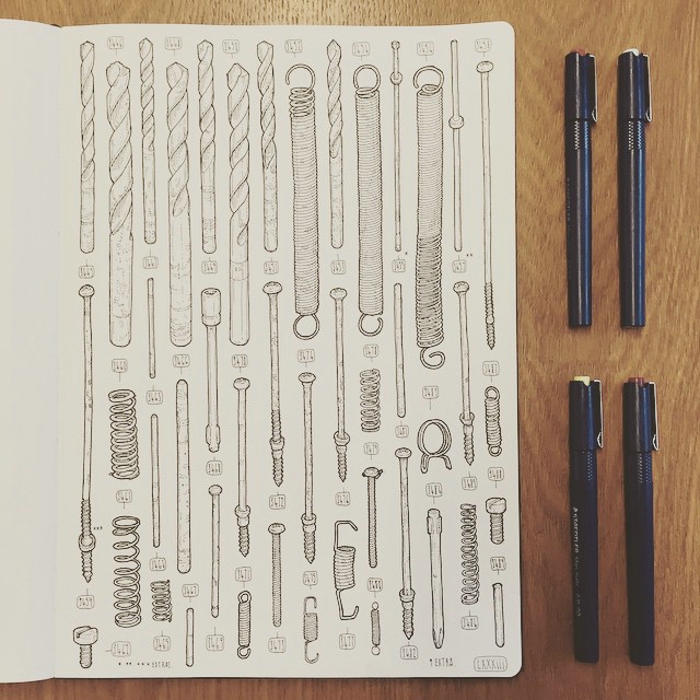 有时候,他一天会画15个小时,也有时候会画10分钟,现在已经画了4000件,包括每一个钉子,每一个螺丝。lee决定要将这些小零件工具全部画下来,而不是将其整理好它们出售或者转让给别人。这么长时间以来他一直坚持绘制,都是为了留住爷爷奶奶给他留下的记忆。