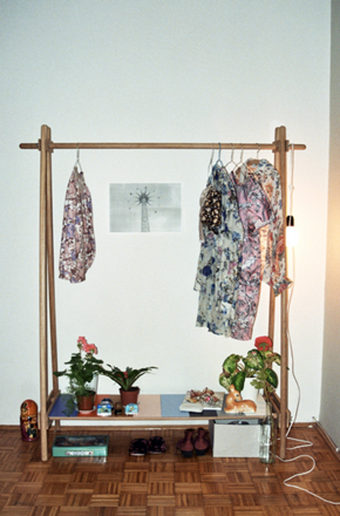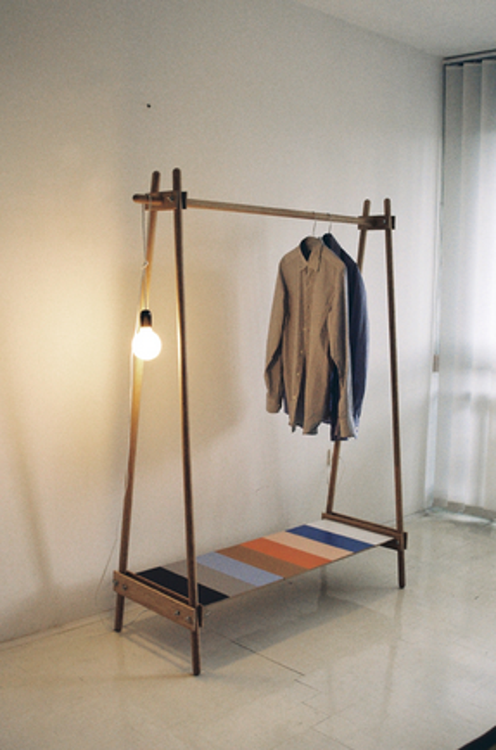 《木琴衣架(KSILOFON CLOTHING RACK)是由木头、橡树枝和胶合板做的衣服架子。形式简单,可简化为三截式,最上面是挂衣服的衣杆,中间两头各一个三脚架,最下面为一个木板,木板是格子状的,就像琴的键盘一样,并且格子的颜色各不同。整体看起来,这款衣架给人一种朴素大方的感觉。