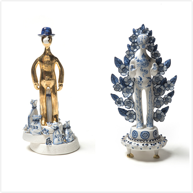 这个系列12件作品,统一的白蓝色调,部分以金色点缀,是艺术家从欧洲18世纪的人偶形象出发,用东方艺术手法塑造出的不分性别和面部特征的陶瓷人偶。这些人偶或站或坐,有些骑坐在神话怪兽背上,人偶背后则点缀着植物、树枝、贝壳、鲜花、书本等小装饰。为了点明系列名称,这十二个人偶代表了赚取一百万获得成功的十二个步骤,每个步骤的人偶与身后的装饰细节都非常逼真,以小见大,讽刺了社会媒体、名流和社会体制的无节制膨胀。