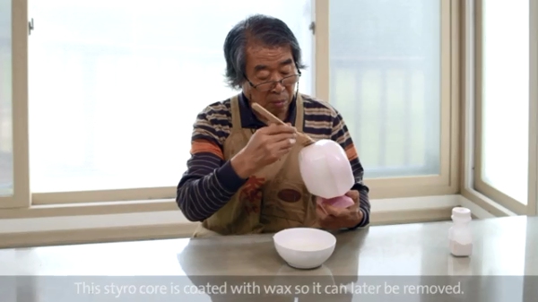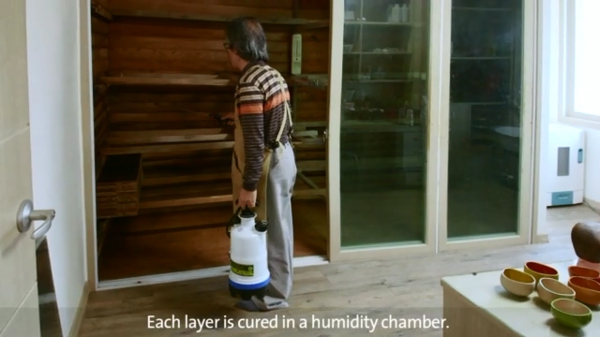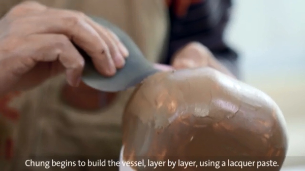 说起这种漆器的制作过程可是件极费心力和耐心的一件事。Chung Hae-Cho从无到有的创造,就像是个建筑师,既要在搭建前心中有数,又要给建筑添砖加瓦。每一次他动手前,已在脑中有了作品的自然外形,然后在一块泡沫上模仿;给泡沫定型后,在其表面涂上不同类型的漆,等到最后成品至少需要6个月的时间。这种工艺被称为干漆技术。