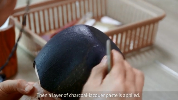在泡沫模型上一层层地涂漆,这种漆是由生漆和粉末状黏土混合而成;
