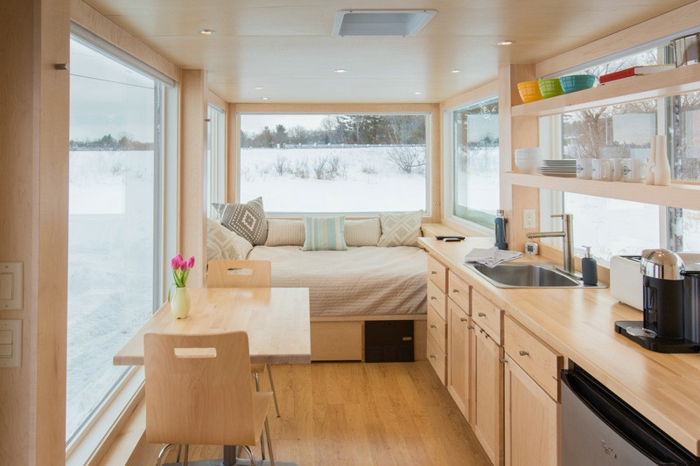 当我们走进屋内时,映入我们眼帘是一个坐卧两用的椅子,小厨房,浴室,餐桌以及多功能储物区。古人云,麻雀虽小,但是五脏俱全,Vista亦是如此。