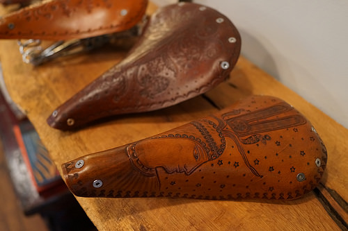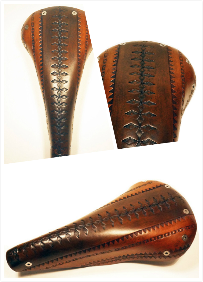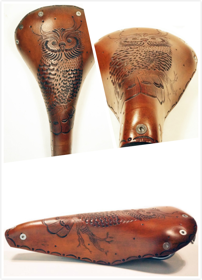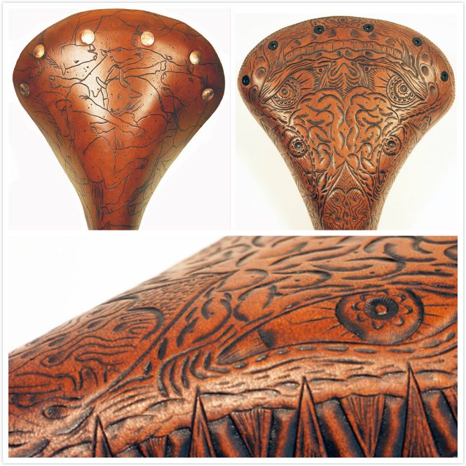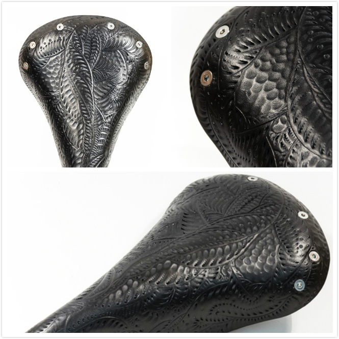 这些皮具自行车坐垫加工工艺精湛,坐垫表面的皮具浅雕,或是自然界中的繁花、鸟兽,或是带有部落民俗风情,又或是繁复纹理的精细化重复,每个都足够惊艳。而惊艳的背后,则是艺术家对皮具处理的精益求精: