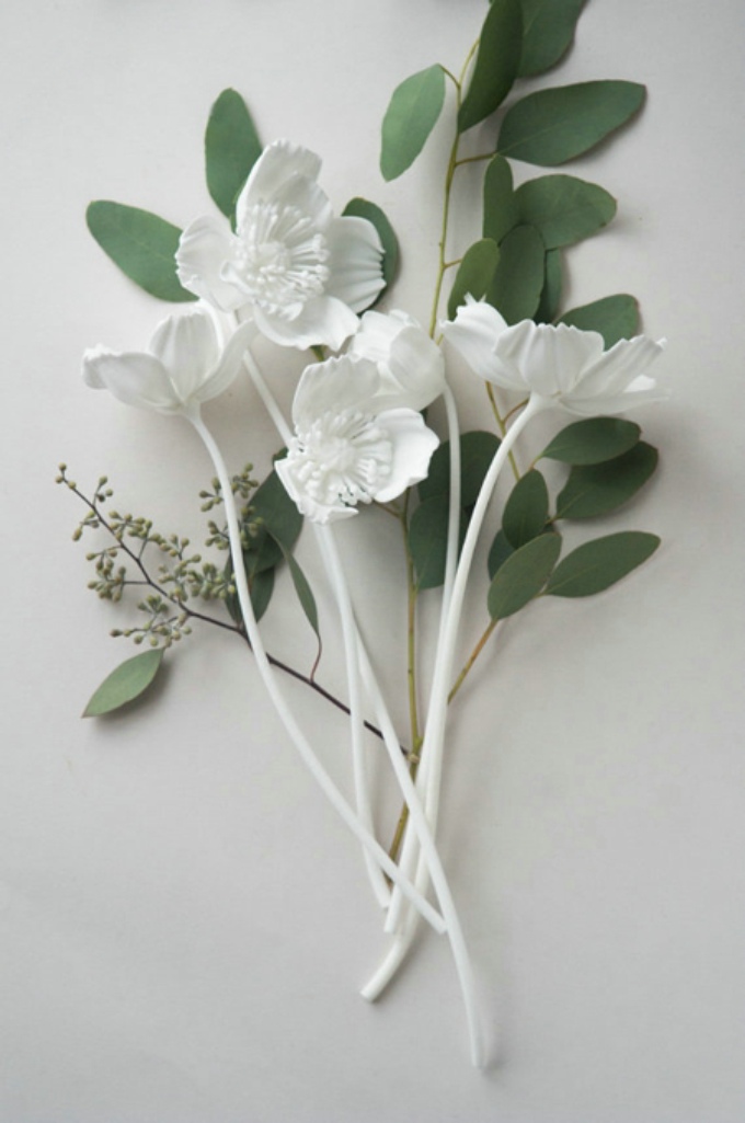 从首饰设计的手绘草图开始,Kasia Wisniewski先用3D建模软件进行设计稿的数字绘制,随后将建好的模型图导入3D打印机,用尼龙材料进行打印。打印过程中,尼龙材料在选择性激光烧结术 (Selective laser sintering, SLS)下,被激光逐层照射,从而使的尼龙粉末熔接粘合,从而堆叠为三维首饰。尼龙材料延展性高,重量小,而且可以很好地体现首饰设计的细节表达,所以设计师常常用它来呈现一些头饰作品(如下图中的兰花花冠头饰)。