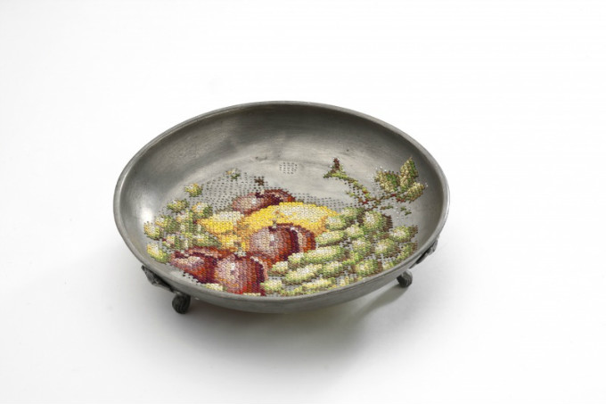 通过针线绣出的俗气的花朵和这些生锈、古旧的金属器皿表达出来,