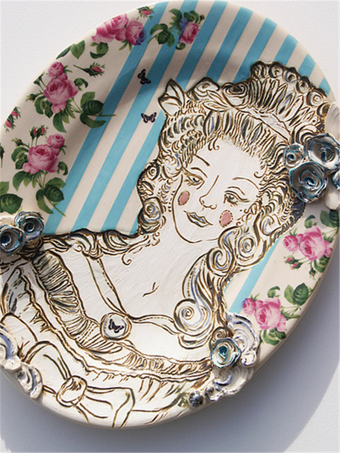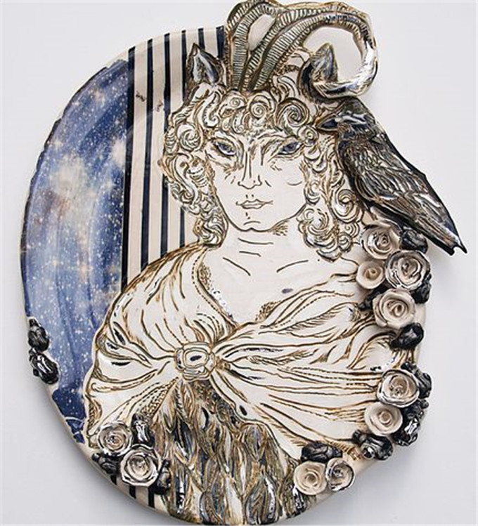 她的挂盘作品用一系列繁复的花纹装饰盘子,每一块都有一个引人入胜的故事,激发观众的想象力。“古怪的纽斯特德”是艺术家另一个系列大理石雕像人物的集合,其中的人物形象来源于诺丁汉郡的纽斯特德修道院,伦敦维多利亚和阿尔伯特博物馆也是Anna常去的地方,这里人们古怪的头发、神秘闪亮的眼睛无一不吸引着Anna的眼球、给予她灵感。