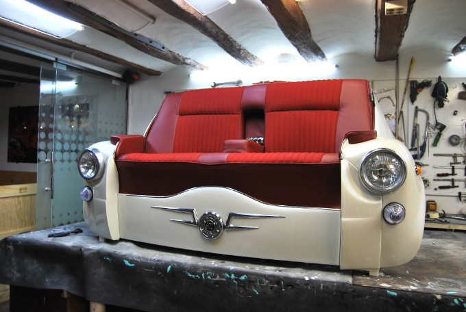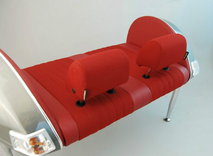 这个沙发是由一个真正的西雅600的汽车座椅改造而成。沙发整体结构延用了汽车的钢铁床架金属型材:两个前翼和车辆前部车头、汽车后座座椅。沙发背部新增了原汽车的后尾箱,用来放置电源插座、配备迷你酒吧和音响。更为酷炫的是,这件作品真实还原了汽车原来的灯光细节,通过接通电源后,沙发前部的两组汽车头灯依旧可以打灯发光。这张西雅600沙发重现了60年代的风情,让它成为了一种永恒的艺术品和设计。