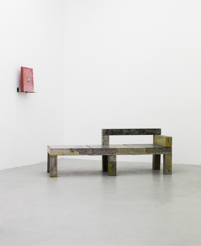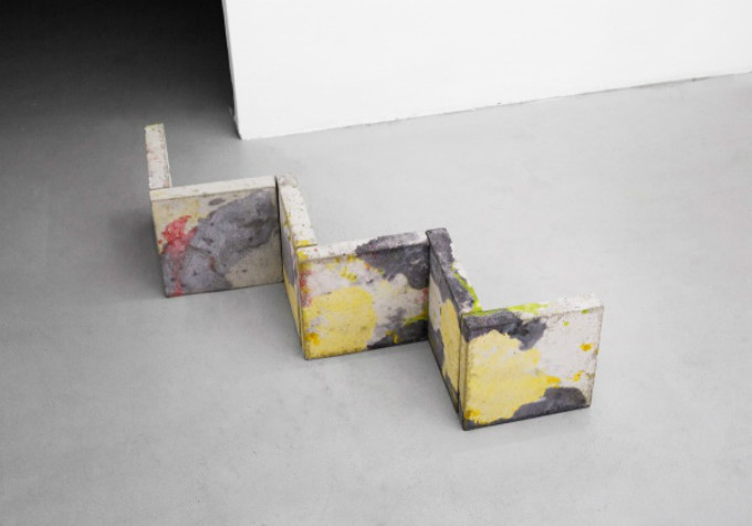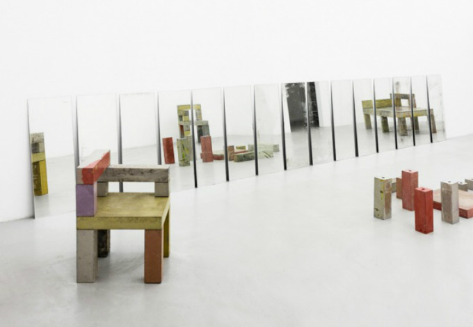作品包括两张单人椅、一张沙发床、一个装配组合、一个雕塑和五幅装饰画,全部作品均由水泥材料制成。为了赋予这些作品独特的艺术属性,两位设计师对水泥材料进行了独特的染色处理,灰色调的混凝土粗糙面,鲜艳的红色、黄色、粉色、紫色调相融,形成光滑与粗糙质感的对比。作品展出的空间里,墙边整齐地安放着一排复古镜,整个系列作品在镜子中呈现,虚实之间,材质的艺术性和功能性完美融合。
