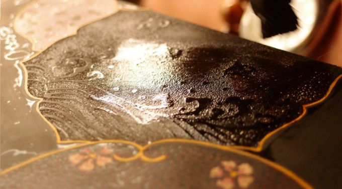 当所有颜色的漆上完之后,开始上面漆,面漆覆盖整体,面漆的颜色也就是整个器物的底色。面漆需要建立厚度,所以需要一遍遍反复的干燥-刷漆,小型器物周期三个月,大型器物需要半年才能制作完成,所以在日本一双手工制作的漆器筷子价格卖到上百元人民币。