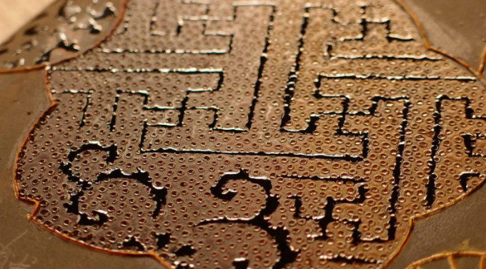 研磨后,线条显现出来,漆特有的光泽,而其他部分由于碳粉与漆结合造成哑光效果。