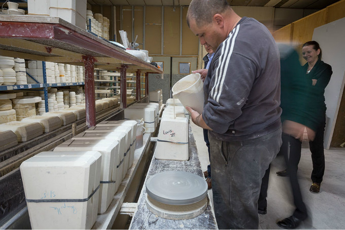Wersailles灯具的基础构成元素为瓷烛台,瓷烛台主要分三个部分组成,灯芯、灯托和烛台,分黑金白三色,组合成整体。此外,部分烛台还以高贵的黄金色装饰点缀,突出传统利摩日瓷器的白度和细腻。别看这盏灯采用了重复的烛台元素,但这些小小烛台背后却是一个繁复的制作工序,让我们一起来看看制作工艺。