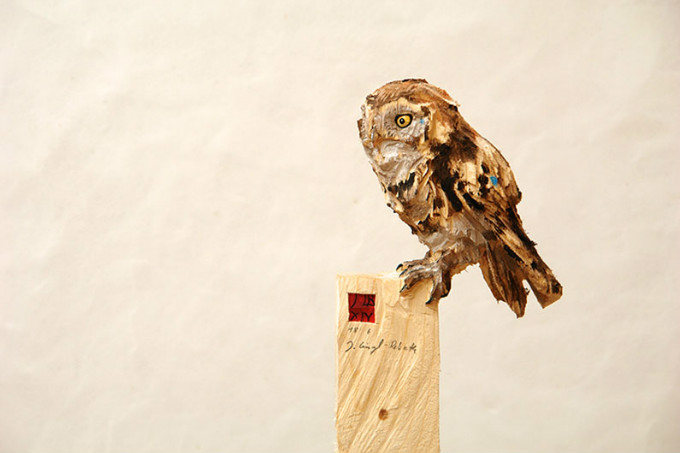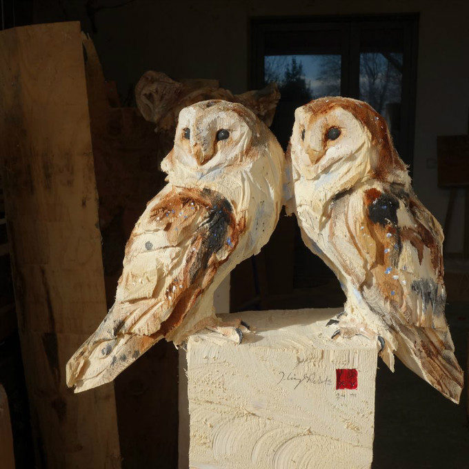 切口果断利索,放荡不羁的刻痕遍布雕塑全身,与木头的粗糙质感相得益彰。无论是厚实的皮毛还是丰盈的羽翼,不加修饰的木头雕塑品为壮汉Jürgen Lingl-Rebetez所特有的个人风格。不让艺术脱离生活和自然,或许就是这些粗糙的雕塑品魅力所在。