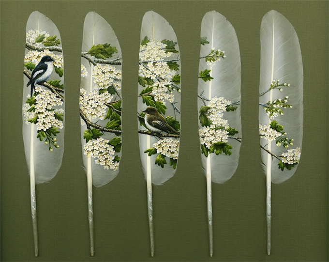Davie在羽毛上作画的灵感来自于新西兰毛利人的羽毛艺术作品,他40岁开始创作,经过多年的磨练,技能一直在精进。现在,戴维的每幅“天鹅羽毛画”都要卖到700英镑(约7000元国民币)的高价。戴维创作的“羽毛画”不仅成了威尔士古代艺术博物馆中的展品,并且他还成了格洛斯特郡天然艺术博物馆的常驻艺术家。
