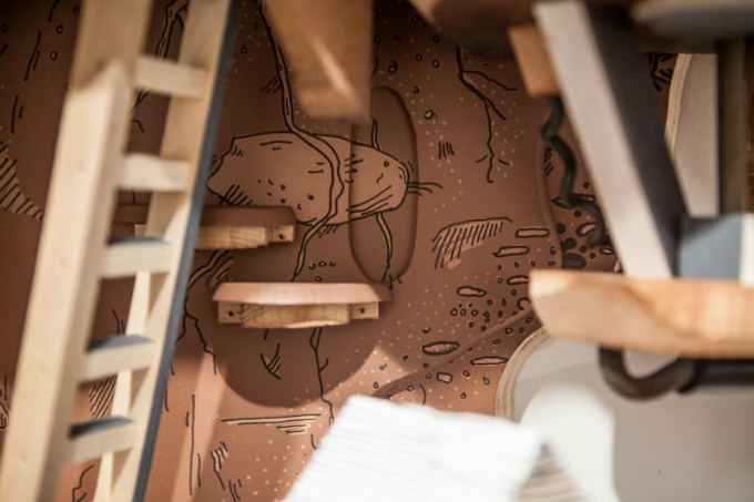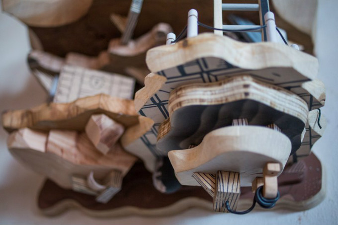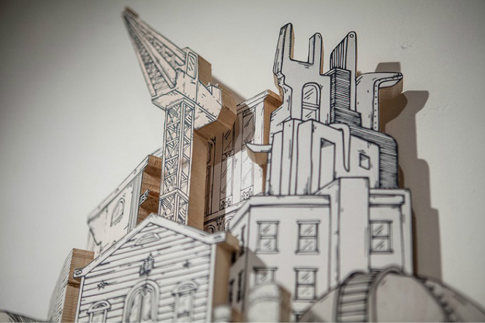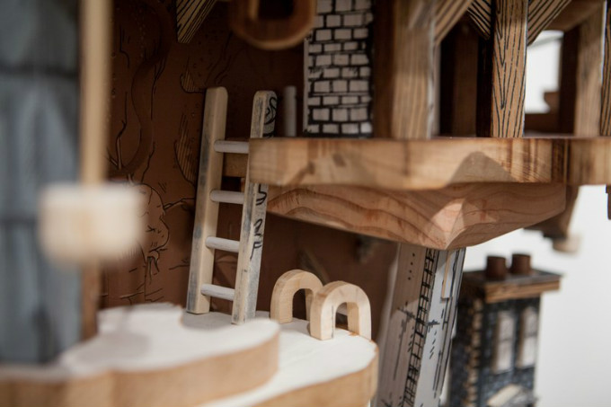 他利用丝网印刷将他绘制的二维城市风貌印在木板上,伫立起那看似繁华的城市。上方二维的城市苍白无力,而下方是充满着活力和生机木雕。低矮的老房子,生锈的金属管道,水桶,各色楼梯和围栏,和上方的高楼大厦相比,似乎地下的世界更别具风味。