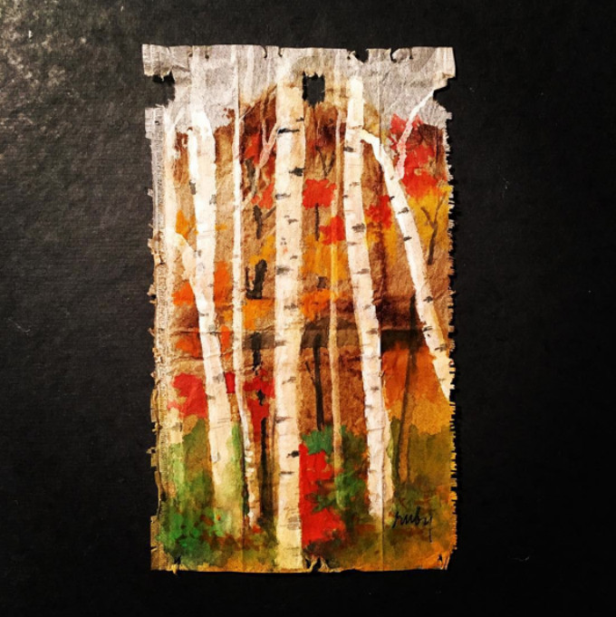 去年年初她开始了一个项目,名为“363 Days of Tea”(茶的363天),在网上引起了极大的关注,她用日常喝完的茶包当画布,在茶包上进行创作,无论多忙,身在何处,每天都会画一只茶包。为这些废弃小物件用色彩加以点缀的同时也用绘画记录着自己的日常生活。