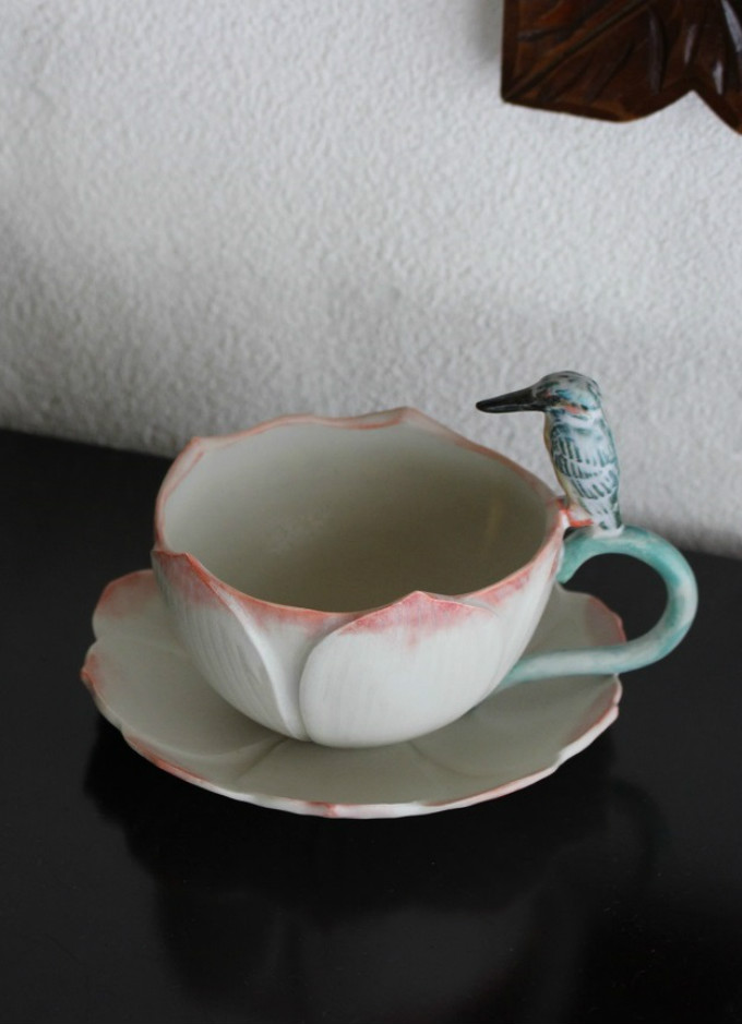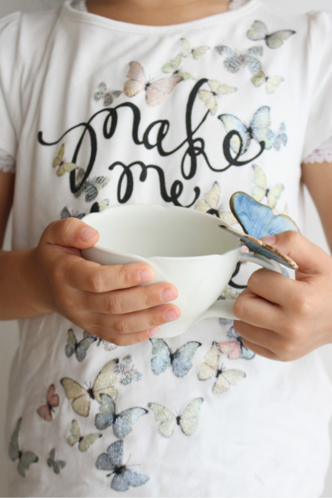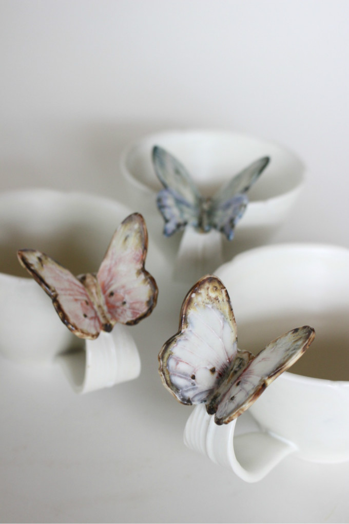 为了完成这个系列的作品,安达收集了大量的蝴蝶标本,甚至还捕捉了好些蝴蝶回来放在瓶中观察,以求还原得更加栩栩如生。好似因香气而驻足的蝴蝶,其实是一个非常人性化的设计,可以让人稳稳地拿起杯子,同时看上去十分优雅。