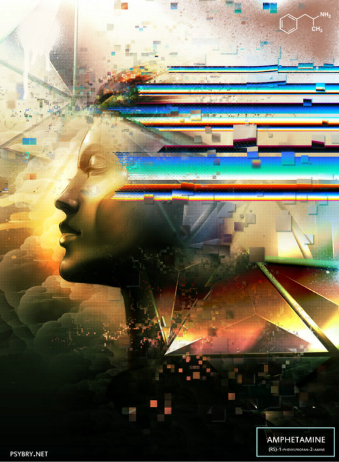 来自美国田纳西州的艺术家Bryan Lewis Saunders以身试法,分别服用了59种不同的药物进行自画像创作。而平面设计师Meaghan Li则设计了一组关于几个常见毒品影响人脑的具象化图示系列。当然,这不是他自己的亲身体验,而是咨询了使用过致幻剂的人们之后绘制的成果。将两人重合的部分放在一起对比,我们似乎看了到某种关联。