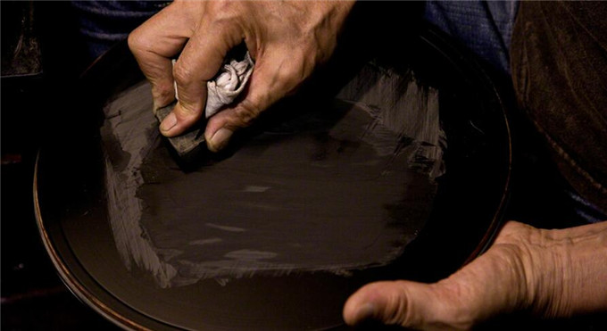 上涂,大体包括妆涂和推光妆涂,是指完成近百遍面漆涂抹,而推光,则是用专用的研磨炭,反复打磨,使器物表面平滑,并在打磨过程中不时加入一些漆。最后,用人手柔和地进行摩擦,才能呈现出漆自身特有的深沉亮丽的质感。整个工序全部有124。我们难以想象,即使是最普通、最朴素的一只碗,做完这些工序也需要花费一年的时间,在此基础上莳绘和沉金等工艺装饰。