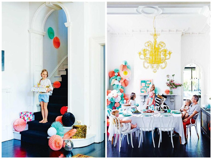 Mish Lilley的家居里橙色、黄色的大胆运用和维多利亚时期的吊灯一点不违和,作为三个孩子的妈妈,房子里当然少不了很多童趣的元素,纸花、儿童房里的波普圆点充满了天真可爱。
