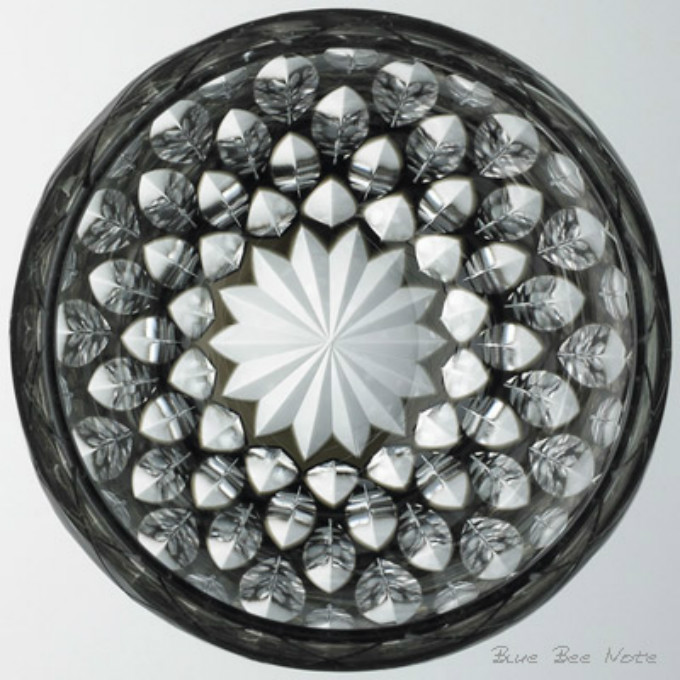 3、细刻:雕刻细致的花纹。进入制作江户切子最重要的部分,此时匠人需要把所有注意力集中到纹样以及设计的细致之处,全力以赴地进行雕刻工作,如有一点失误,切子就等同废品,且细刻并无参考线,匠人只能按照脑中构图进行雕刻。