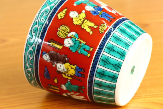 11、彩绘:根据陶艺家个人的喜好及技法,主要以九谷五彩(红、绿、黄、紫、靛青)来进行彩绘过程。