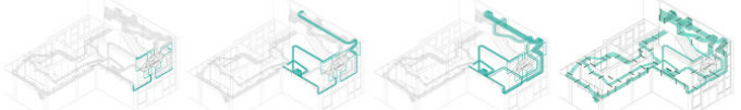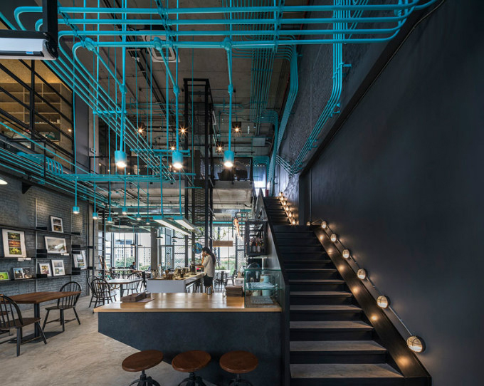 这就是他们的设计,被涂成蓝绿色的机电线贯穿整个的室内空间,一气呵成的复杂组织让人想起崇尚精密逻辑的机械美学。在这个方案中,电气管线不再被当做应被隐藏的部分,设计师故意增加了它们的数量以形成一种空间中的“马太效应”。明亮的颜色强化着这些管线给人带来的视觉冲击,带着点儿未来感,又不失典雅、清新。曾经被设计师们避之不及的设备管线反而在这里成为了空间特色,人们的视线不由自主地就会跟随着这些包围空间的线性元素。
