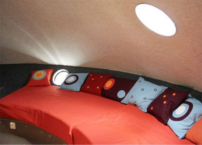 顺着旋梯爬到UFO内部,30 平方米的圆形房间分隔出了卧室、餐厅和卫生间。是为两个大人、两个小孩的四口之家设计的,室内设计是以星空为主题,十分和谐。