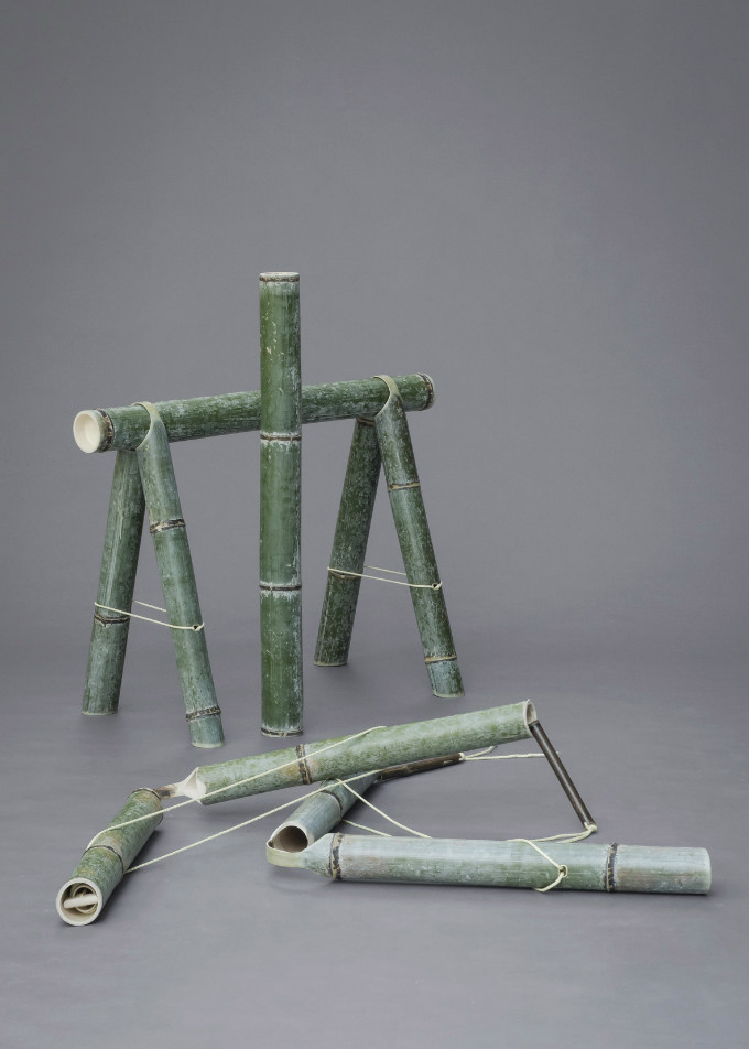Diez最大的巧思就是在竹身的中间削出了一段薄片状的竹条,使竹身对折后中间可以留出圆洞而恰好容得下另一根竹身,而折叠后的竹身只需要用足够有韧性的纤维绳固定住即可。这个听上去简单的工序包含了三处需要精心设计的关键,一是被削出的竹条的宽度必须有足够的强度保证其不会断裂;二是折叠后形成的圆洞直径必须与竹身直径一致,这则需要精准的计算;三,如何美观又具可操作性地将螺纹绳穿过竹身。
