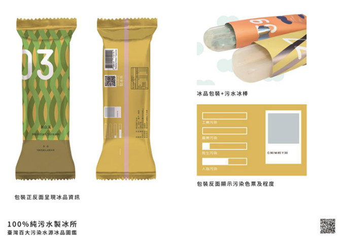 事实上,这是台湾艺术大学视觉艺术系的学生郑毓迪、洪亦辰、郭怡慧合作的毕业设计。经历一年的时间进行准备、制作,她们将取自台湾100个污染水源地的水制作成1:1的聚酯“冰棒”模型,并配以图鉴的方式作为最终呈现。设计者希望通过美丽的包装与内容物的反差来引发人们对水污染问题的思考。