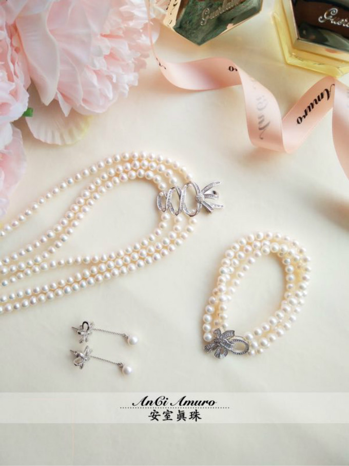 安室真珠之“优雅一生”系列,项链采用200颗天然虹光白珍珠手工穿制而成,添加纯银丝结造型吊坠,更加衬托出佩戴者优雅华美的气质。