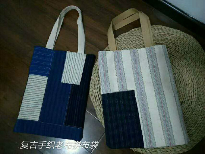 来自几米手作工作室的条纹粗麻老布包,老布淘于苏州村落,有明显麻结和粗纱小斑点。裁剪使用了不同色彩的拼接方式,里布是肌麻。前片的拼布是开口的,方便放东西。