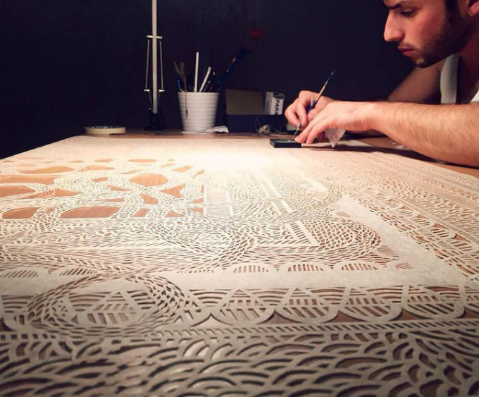 作者仔细地剪出每一个纸雕塑。