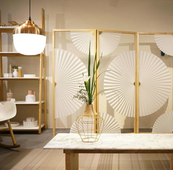 他们将金属屏风框架与东方纸扇元素结合起来,