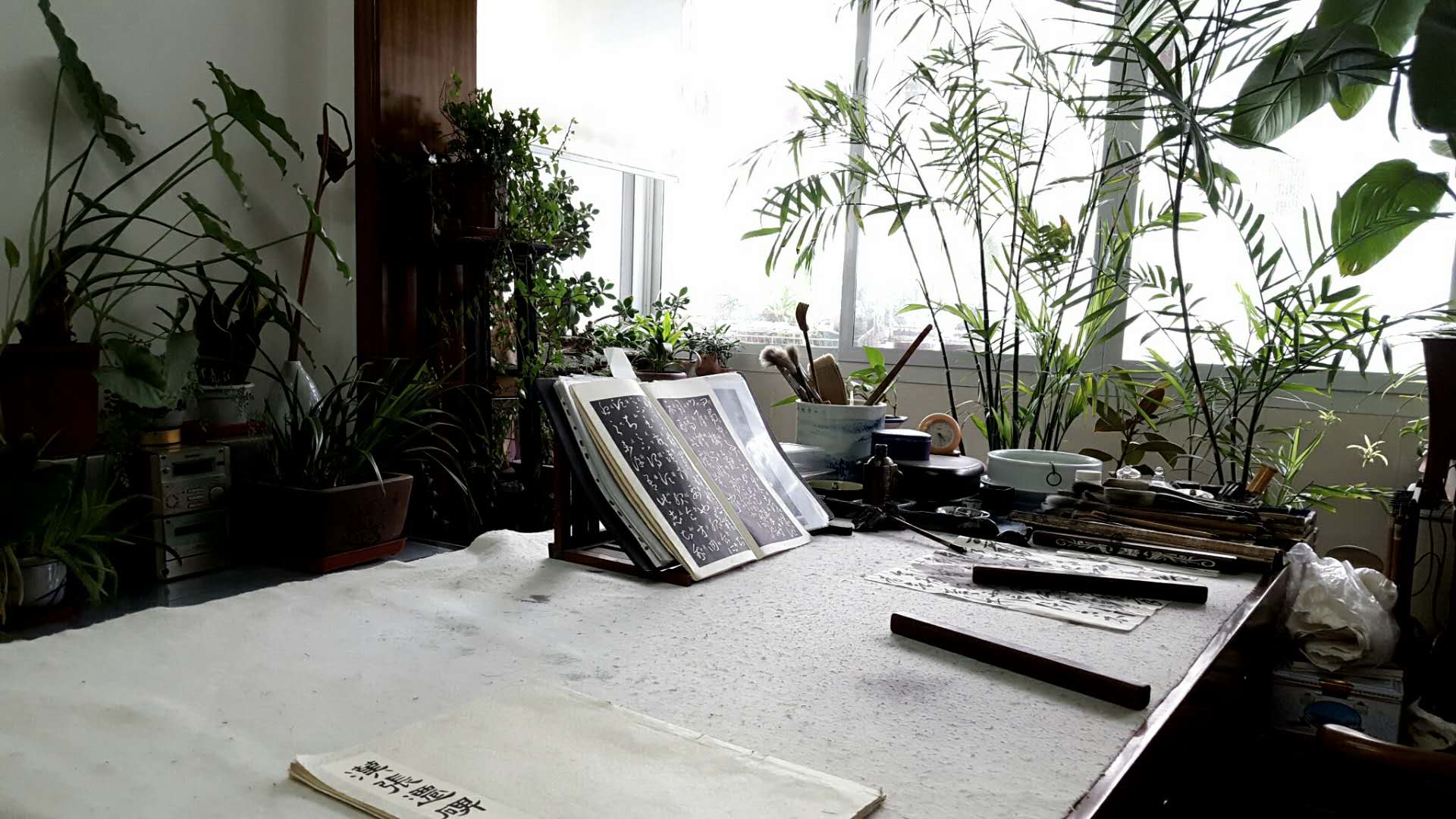 墙旁边有一个小矮桌,放的全是毛笔和竹简,也是形成了工作室一角风景线。