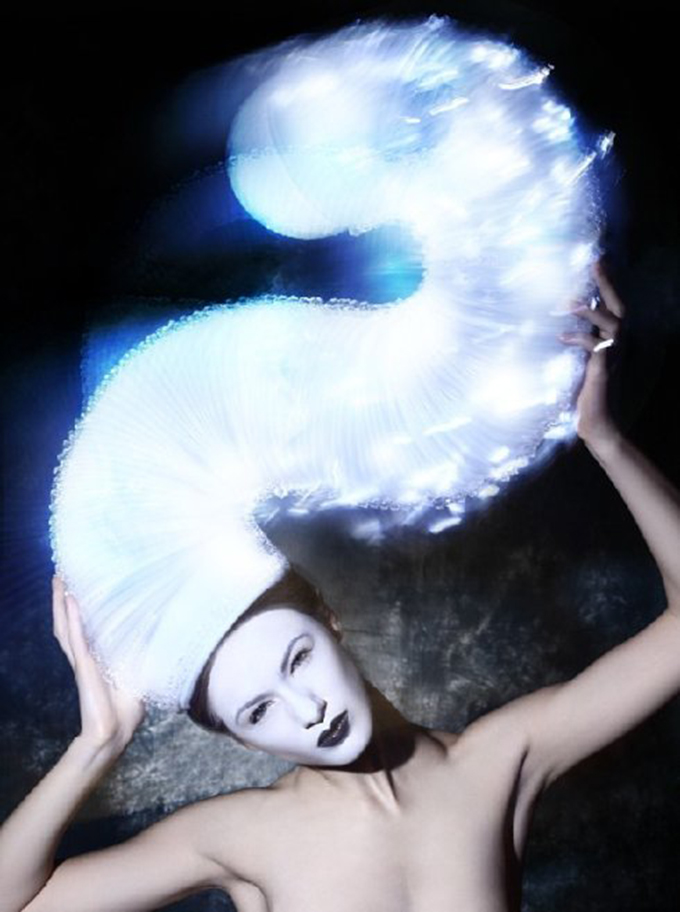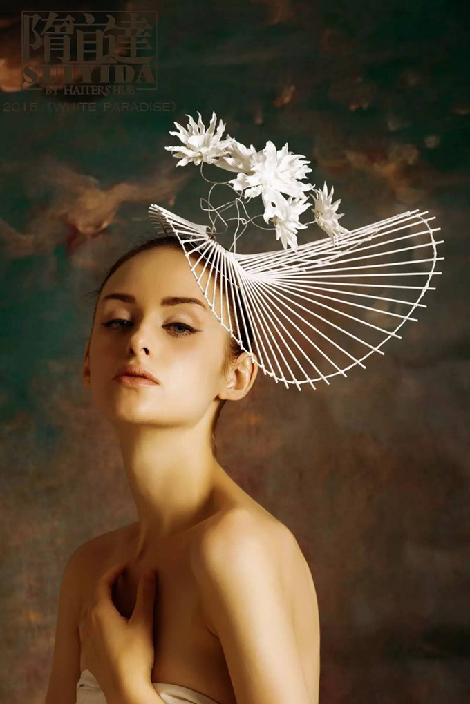 杨丽萍在表演大型舞台剧《孔雀之冬》时所戴的雪花白羽包裹型帽饰,神圣脱俗,就是出自隋宜达之手。