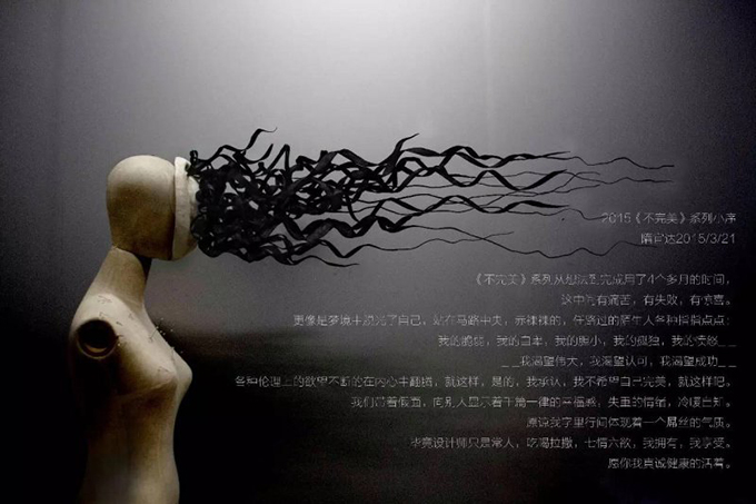 不完美人面系列——人与人的交流都是隔着面具的,长大以后,都会给自己下个定义,如何去沟通,才不会把心底最柔软的东西说出来。“原谅我坐在马桶上思考我的人生,不完美就是最真实的状态。”这句话来自他给自己的作品写的序言。