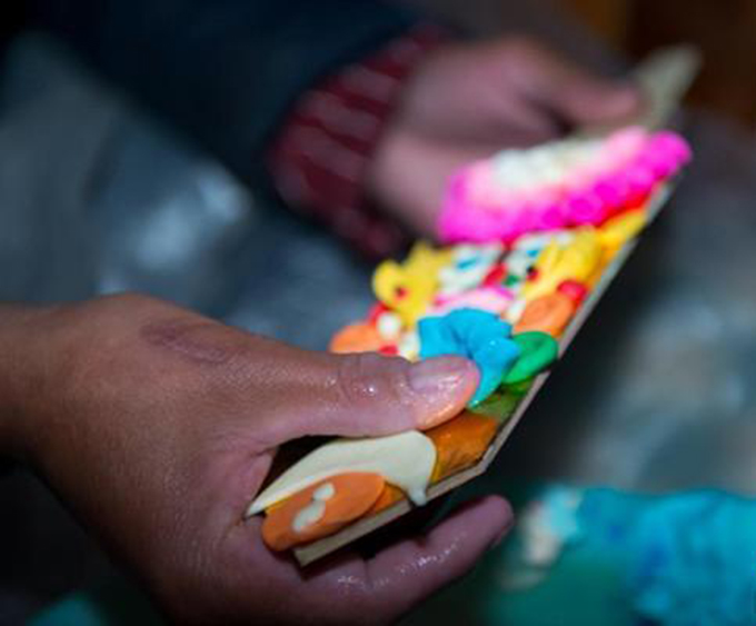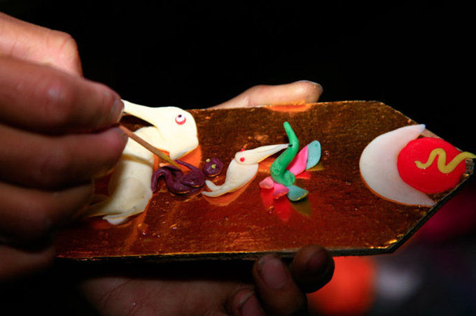 其次是塑造形态,即"做胚胎"。塑造的第一道原料是直接将去年的酥油花和草木灰糅合在一起反复捶捣,直到出来的黑色油泥弹性好又富有韧劲。再将黑泥嫁接到基本骨架上,粗糙且准确的塑造出酥油花造型,其塑法有点像面塑或泥塑。基本形体做好后,用掌尺进行尺寸上的衡量,在整体的结构比例上做修改,以及对各个物体姿态做更精准的调整,审定后,这个环节才算结束。