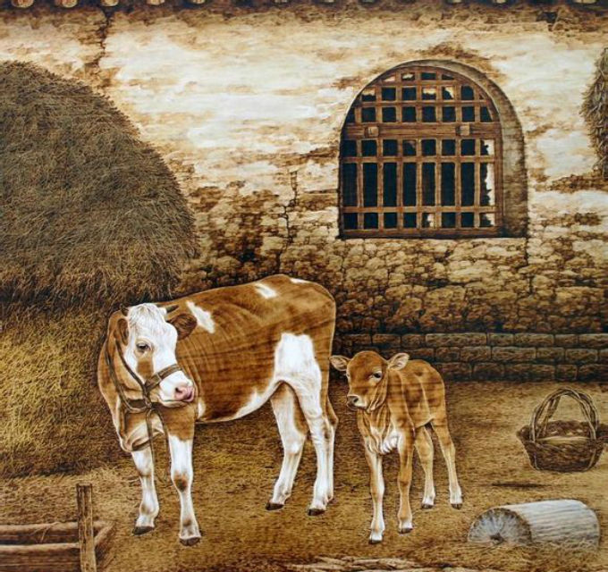 郝友友还将西洋画的写实、国画的严谨融入现代烙画中,再吸取版画、刺绣等民间工艺的精髓,继而创造了郝氏独有的烙画技法,放眼整个现代烙画界,恐怕也无一人敢说自己能越过其高超的烙画水平。