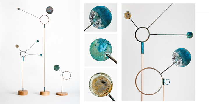 微风是一个显示风向的系列。该雕塑是由三个木架组成,这些木架保持着扁平的氧化铜圆圈和圆环,由杆子连接在一起,以显示风向。