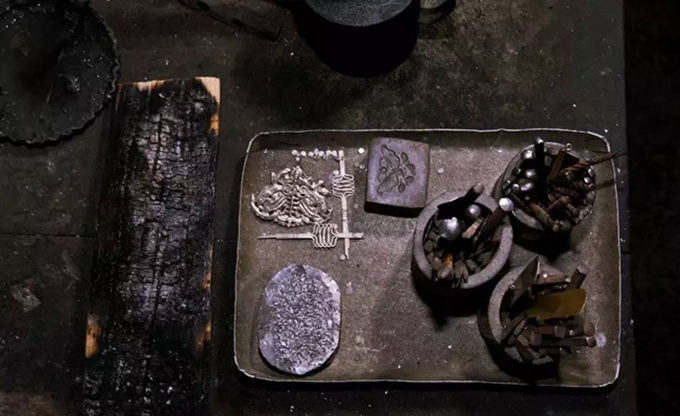 作为一个苗族银匠,麻茂庭每天的生活内容只有四个字“锻制苗银”,早上十点就开始苗银锻制,然后不间断工作到深夜。首先要做的是熔银,在熔炉中生起炭火,拉风箱呼呼作响的同时,青色火焰熊熊燃起,把银饰的边角料倒入一个小铁杯中,放在炭火上熔炼,这是一个漫长且枯燥的等待过程,但是任何一件精美的银饰都是这般浴火重生而来,没有例外。