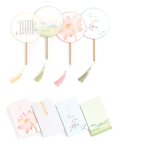 这个系列有四种扇面,分别取自《出水芙蓉图》,一朵盛开的粉红色荷花占据整个画面,抢眼而夺目;宋徽宗《夏日》诗贴“清和节后绿枝稠,寂寞黄梅雨乍收。畏日正长凝碧汉,薰风微度到丹楼。池荷成盖闲相倚,径草铺茵色更柔,永昼摇纨避繁缛,杯盘时欲对清流。”;《千里江山图》的局部、以及项圣谟花卉书画图。