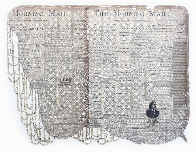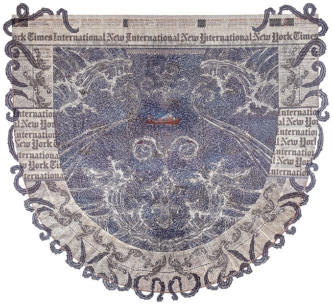 「相比于繁复的文字报道,如今人们更愿意通过图片和标题来了解一条新闻。于是我在想,如果用镂空工艺覆盖文字报道,突出核心图案,呈现更符合现代人阅读习惯的报纸作品。」