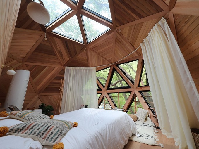 位于广西桂林阳朔遇龙河畔的泡泡屋分上下两层,上层是一个大型卧室,配备空调使屋里冬暖夏凉;下层是豪华卫浴间和休息室。得益于泡泡屋的半透明状,住宿者可以看到外面的花海、喀斯特地貌以及月亮和星空。如果不想被他人看到屋内景象,还可以拉上顶部的遮阳棚。