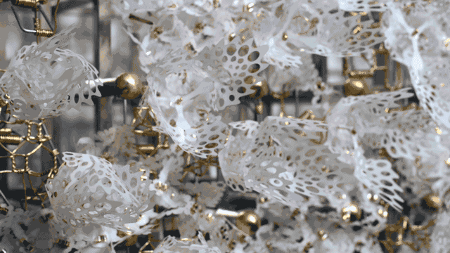 这是一件会动的雕塑作品,椭圆形的立体支架上层层叠叠铺设着白色的镂空「纸片」。特别的是,这些纸片好像一张一合,既像是挥舞的翅膀又像是盛开的花瓣。